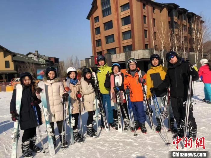 許迪(右三)與臺灣青年在東北體驗(yàn)滑雪。受訪者 供圖