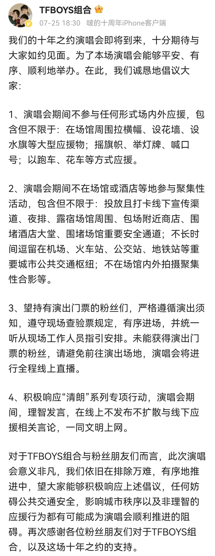 早前,TFBOYS組合官微曾發(fā)布聲明,再三呼吁大家一定要理智,尤其提到任何妨礙公共交通安全,影響城市秩序以及非理智的應(yīng)援行為都有可能成為演唱會順利推進(jìn)的阻礙。