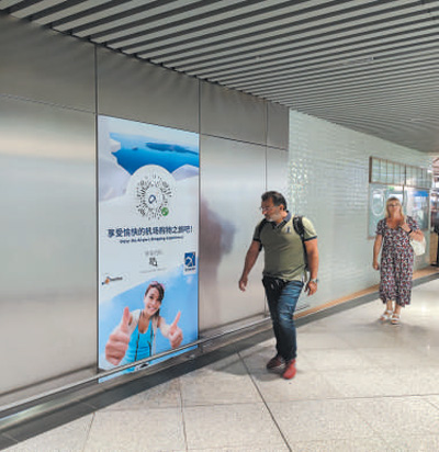 希臘雅典國(guó)際機(jī)場(chǎng)內(nèi),旅客走過(guò)用中文書寫的廣告海報(bào)。