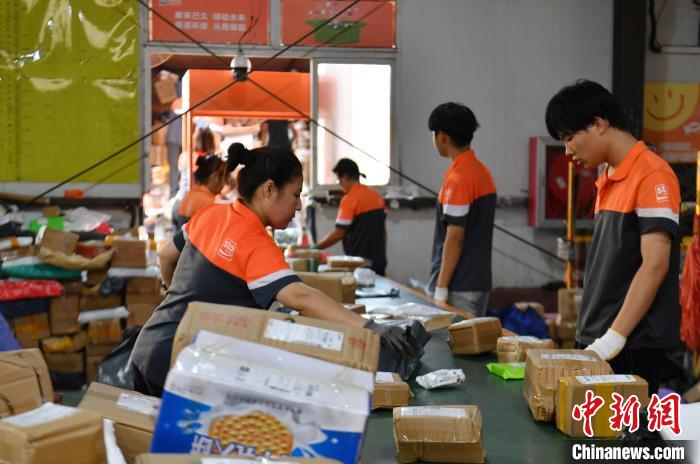 8月9日,在涿州市一家快遞公司,工作人員分揀來自轉(zhuǎn)運中心的快件?!≈行律缬浾?韓冰 攝