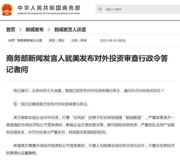 中國商務部新聞發(fā)言人8月10回應稱,美方限制本國企業(yè)對外投資,打著“去風險”的幌子在投資領域搞“脫鉤斷鏈”,嚴重背離美方一貫提倡的市場經濟和公平競爭原則,影響企業(yè)正常經營決策,破壞國際經貿秩序,嚴重擾亂全球產業(yè)鏈供應鏈安全,中方對此表示嚴重關切,將保留采取措施的權利。