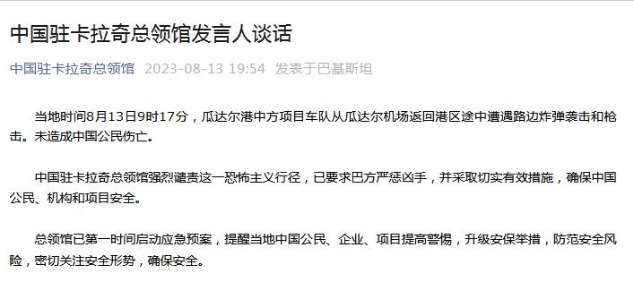 - 中國駐巴基斯坦使館就瓜達(dá)爾港中方車隊(duì)遭遇襲擊發(fā)布聲明