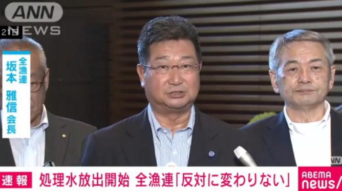當(dāng)?shù)貢r(shí)間24日下午,針對(duì)福島核污染水被正式排入大海,日本全國(guó)漁業(yè)協(xié)會(huì)聯(lián)合會(huì)(全漁聯(lián))表示:“反對(duì)核污染水排海的立場(chǎng),沒(méi)有絲毫改變”。圖片來(lái)源:日本朝日電視臺(tái)視頻截圖