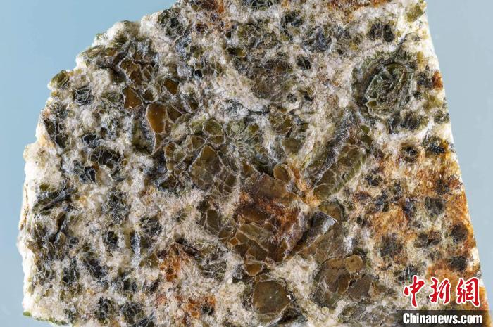 Erg Chech 002隕石樣本。該樣本約20毫米長,由斜長石(白色)和兩種輝石(深綠色和棕色)組成的基質(zhì)中鑲嵌著一塊大的輝石晶體(圖片來自Yuri Amelin)。施普林格·自然 供圖