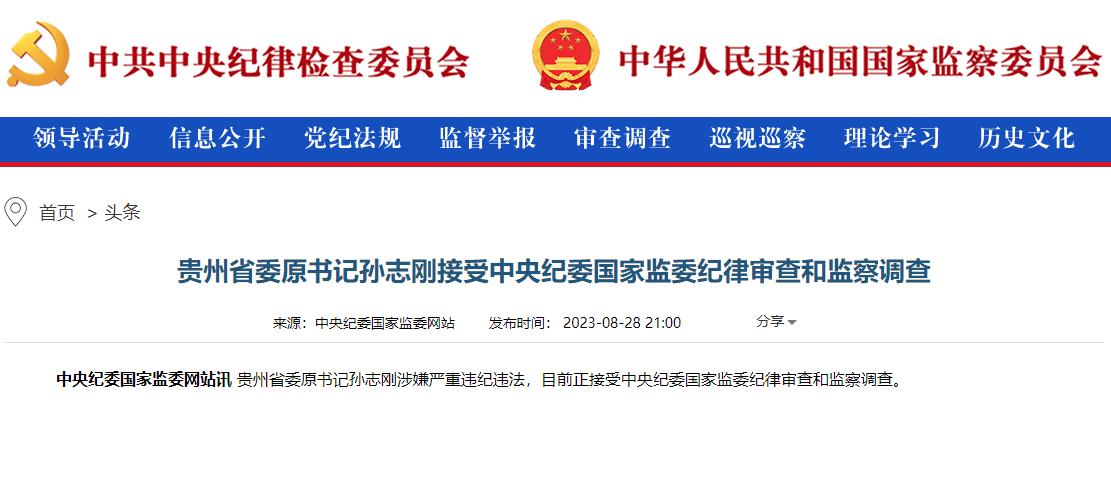 中新網(wǎng)北京8月29日電(記者 袁秀月)又見深夜打虎。中央紀委國家監(jiān)委網(wǎng)站28日晚通報,貴州省委原書記孫志剛涉嫌嚴重違紀違法,目前正接受中央紀委國家監(jiān)委紀律審查和監(jiān)察調查。
