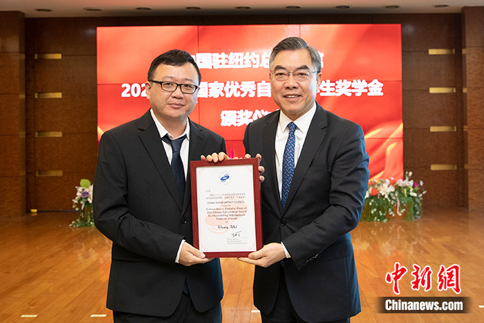 中新社紐約9月2日電 (記者 廖攀)中國(guó)駐紐約總領(lǐng)事館2日在紐約駐地舉行2022年度國(guó)家優(yōu)秀自費(fèi)留學(xué)生獎(jiǎng)學(xué)金頒獎(jiǎng)儀式,中國(guó)駐紐約總領(lǐng)事黃屏為獲獎(jiǎng)學(xué)生頒獎(jiǎng),負(fù)責(zé)教育事務(wù)的參贊余有根介紹紐約領(lǐng)區(qū)獲獎(jiǎng)情況。獲獎(jiǎng)學(xué)生、評(píng)審專家代表等近90人通過(guò)線上線下結(jié)合方式出席頒獎(jiǎng)儀式。