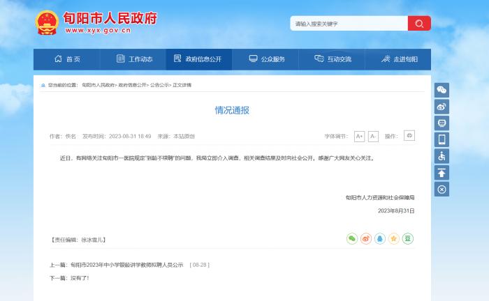 8月31日,據(jù)旬陽市人民政府網(wǎng)站發(fā)布情況通報(bào),旬陽市人力資源和社會保障局已對此介入調(diào)查,相關(guān)調(diào)查結(jié)果及時(shí)向社會公開。