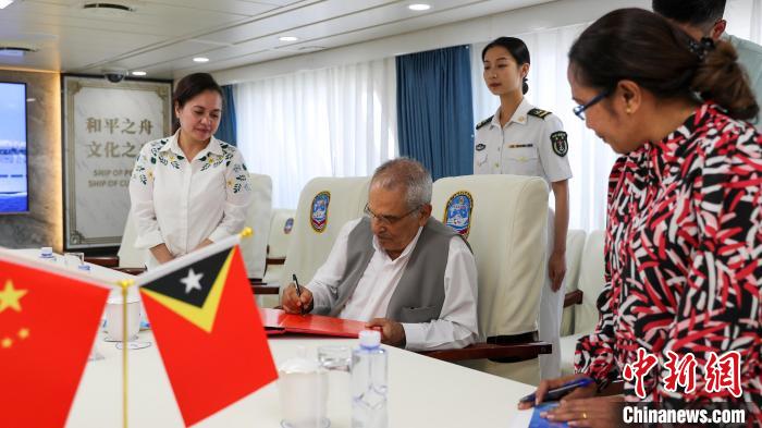 9月3日上午,正在執(zhí)行“和諧使命-2023”任務(wù)的中國(guó)海軍“和平方舟”號(hào)醫(yī)院船抵達(dá)東帝汶帝力港,開(kāi)始為期7天的友好訪問(wèn)和醫(yī)療服務(wù)。圖為東帝汶總統(tǒng)奧爾塔在醫(yī)院船簽名簿上留言。黎宇 攝