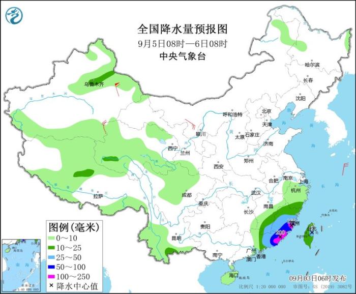 9月5日08時(shí)至6日08時(shí),新疆沿天山地區(qū)、浙江南部、福建大部、江西東南部、廣東中東部、臺(tái)灣島等地部分地區(qū)有中到大雨,其中,福建東南部、廣東東部等地部分地區(qū)有暴雨或大暴雨(100~200毫米)。內(nèi)蒙古西北部、青海西部等地部分地區(qū)有4~6級(jí)風(fēng),其中,新疆東部部分地區(qū)有8~9級(jí)風(fēng)。東海南部、臺(tái)灣以東洋面、臺(tái)灣海峽、巴士海峽、南海東北部有6~8級(jí)大風(fēng)、陣風(fēng)10~11級(jí),其中臺(tái)灣以東洋面、臺(tái)灣海峽、巴士海峽北部、南海東北部部分海域風(fēng)力可達(dá)9~11級(jí)、陣風(fēng)13~14級(jí)。