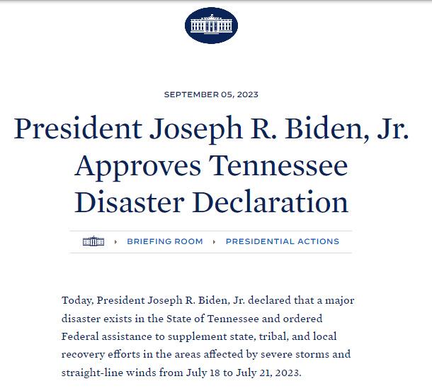 中新網(wǎng)9月6日電 據(jù)白宮官網(wǎng)消息,當(dāng)?shù)貢r(shí)間9月5日,美國總統(tǒng)拜登批準(zhǔn)田納西州重大災(zāi)難聲明,并下令為田納西州從7月18日開始至7月21日期間受風(fēng)暴影響的地區(qū)提供聯(lián)邦援助。