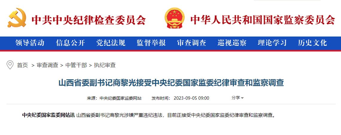 中新網(wǎng)北京9月5日電 5日上午,中央紀委國家監(jiān)委網(wǎng)站發(fā)布消息,山西省委副書記商黎光涉嫌嚴重違紀違法,目前正接受中央紀委國家監(jiān)委紀律審查和監(jiān)察調(diào)查。