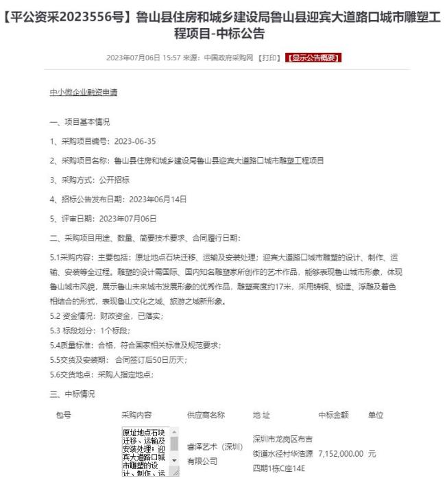 中國(guó)政府采購(gòu)網(wǎng)公開的中標(biāo)公告顯示,這座位于魯山縣迎賓大道路口城市雕塑工程項(xiàng)目,中標(biāo)金額達(dá)到715.2萬(wàn)元,資金情況為“財(cái)政資金,已落實(shí)”。
