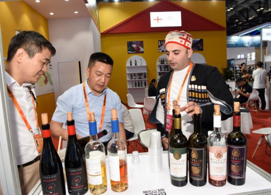 9月4日,參展商在服貿(mào)會的格魯吉亞展臺品嘗格魯吉亞葡萄酒。新華社記者 武巍 攝