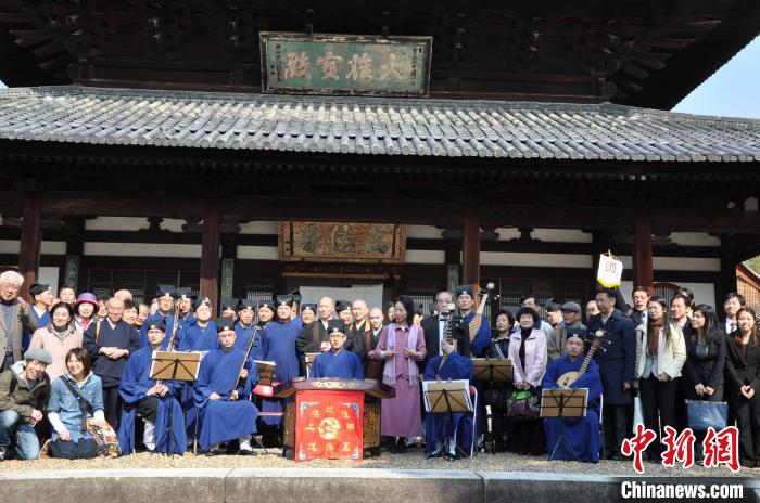 2012年4月8日,上海城隍廟道樂團(tuán)與日本觀眾在萬福寺大雄寶殿前合影?!?上海市道教協(xié)會(huì)供圖)