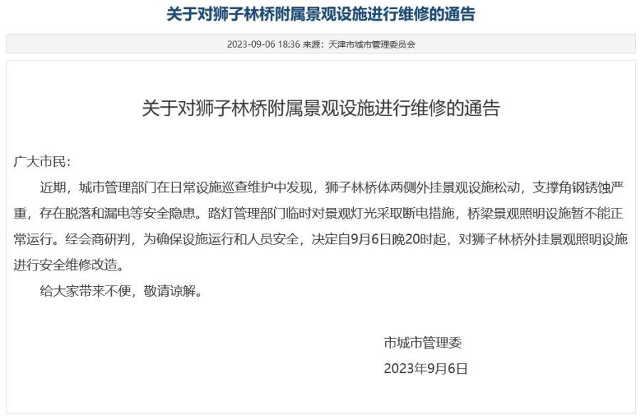 中新網(wǎng)9月7日電 6日,天津市城市管理委員會發(fā)出通告,對獅子林橋附屬景觀設施進行維修。天津市城市管理委表示,近期,城市管理部門在日常設施巡查維護中發(fā)現(xiàn),獅子林橋體兩側(cè)外掛景觀設施松動,支撐角鋼銹蝕嚴重,存在脫落和漏電等安全隱患。路燈管理部門臨時對景觀燈光采取斷電措施,橋梁景觀照明設施暫不能正常運行。經(jīng)會商研判,為確保設施運行和人員安全,決定自9月6日晚20時起,對獅子林橋外掛景觀照明設施進行安全維修改造。