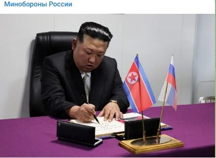 當(dāng)?shù)貢r間16日,金正恩在俄“沙波什尼科夫元帥”號護衛(wèi)艦貴賓簿上留言。圖片來源:俄國防部社交媒體截圖