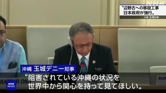 當(dāng)?shù)貢r(shí)間18日,日本沖繩縣知事玉城丹尼在瑞士日內(nèi)瓦召開的聯(lián)合國(guó)人權(quán)理事會(huì)上,抨擊美日政府不顧沖繩民眾民意強(qiáng)行推進(jìn)美軍基地搬遷。圖片來源:日本放送協(xié)會(huì)(NHK)視頻截圖