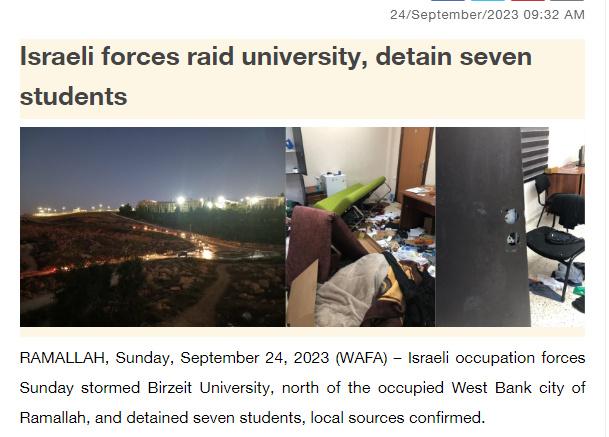 據(jù)報道,消息人士稱,以軍在突襲比爾宰特大學并破壞該校的物品和財產后,逮捕了7名學生,其中包括一名前囚犯。