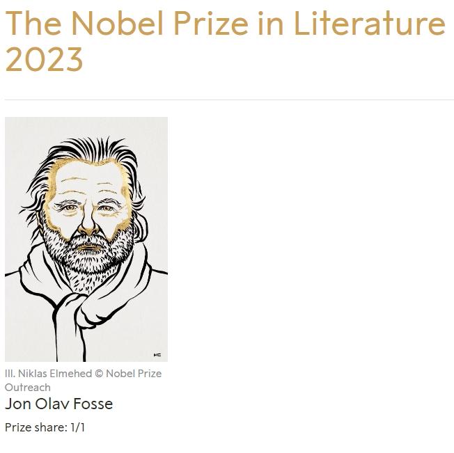 中新網(wǎng)10月5日電(張奧林)據(jù)諾貝爾獎(jiǎng)官網(wǎng)消息,北京時(shí)間5日19時(shí)許,2023年諾貝爾文學(xué)獎(jiǎng)揭曉,挪威作家約恩·福瑟(Jon Fosse)被授予該獎(jiǎng)項(xiàng)。
