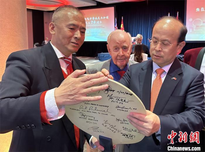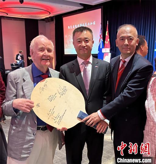 9月28日,中國駐澳大利亞使館與駐悉尼總領館在悉尼聯(lián)合舉辦國慶招待會,隆重慶祝中華人民共和國成立74周年。圖為中國駐澳大利亞大使肖千(右)在澳大利亞乒乓老將諾爾(中)的乒乓球板上簽字留念。中新社記者 顧時宏 攝