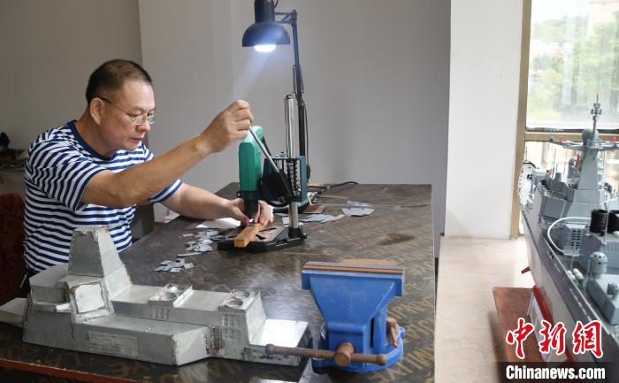 近40年的“造艦”生活,也讓潘雄體會到許多不易和堅守?!白瞿P偷募夹g對于建筑出身的我來說不是難題,對艦船的愛好和制作模型的耐心才是最重要的。”潘雄稱,自己剛開始制作“昆明號”驅(qū)逐艦時并無多少資料可查,每天下班吃完飯后就在工作臺上研究艦炮、桅桿、艦島的整合安裝和細節(jié)對接,經(jīng)常做著做著就到了凌晨。