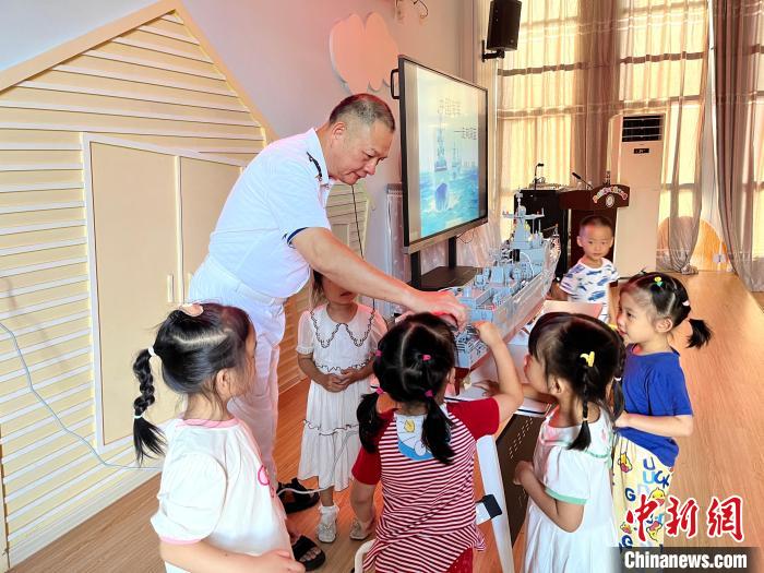 圖為潘雄為幼兒園小朋友介紹艦艇知識。漳州市退役軍人事務局 供圖