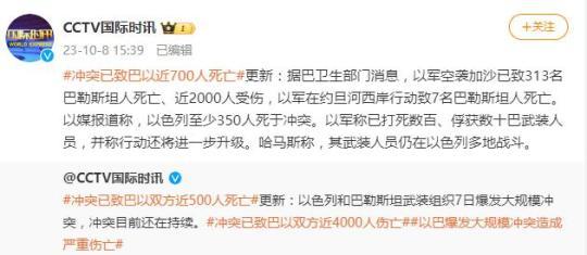 央視網(wǎng)消息:據(jù)CCTV國(guó)際時(shí)訊微博消息,據(jù)巴衛(wèi)生部門消息,以軍空襲加沙已致313名巴勒斯坦人死亡、近2000人受傷,以軍在約旦河西岸行動(dòng)致7名巴勒斯坦人死亡。以媒報(bào)道稱,以色列至少350人死于沖突。以軍稱已打死數(shù)百、俘獲數(shù)十巴武裝人員,并稱行動(dòng)還將進(jìn)一步升級(jí)。哈馬斯稱,其武裝人員仍在以色列多地戰(zhàn)斗。