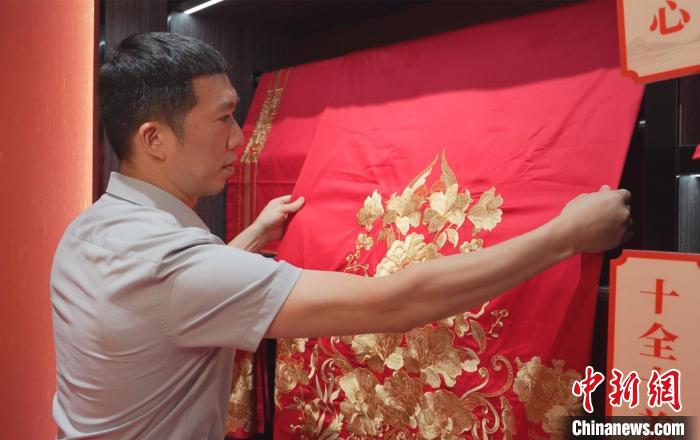 8月28日,“臺(tái)二代”、湖南富麗真金家紡有限公司總經(jīng)理杜俊毅在展廳整理產(chǎn)品。 楊世豪 攝