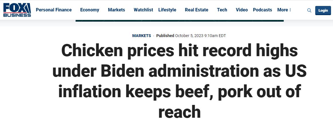 另據(jù)美國??怂股虡I(yè)頻道(Fox Business)網(wǎng)站報道,受到持續(xù)通貨膨脹影響,美國牛肉和豬肉價格保持高位,普通消費者不得不轉(zhuǎn)向略微便宜一些的雞肉。然而,全美零售店的雞肉價格也隨著需求量的增加而水漲船高,更是創(chuàng)下歷史新高,并且預(yù)計還將保持在高位。