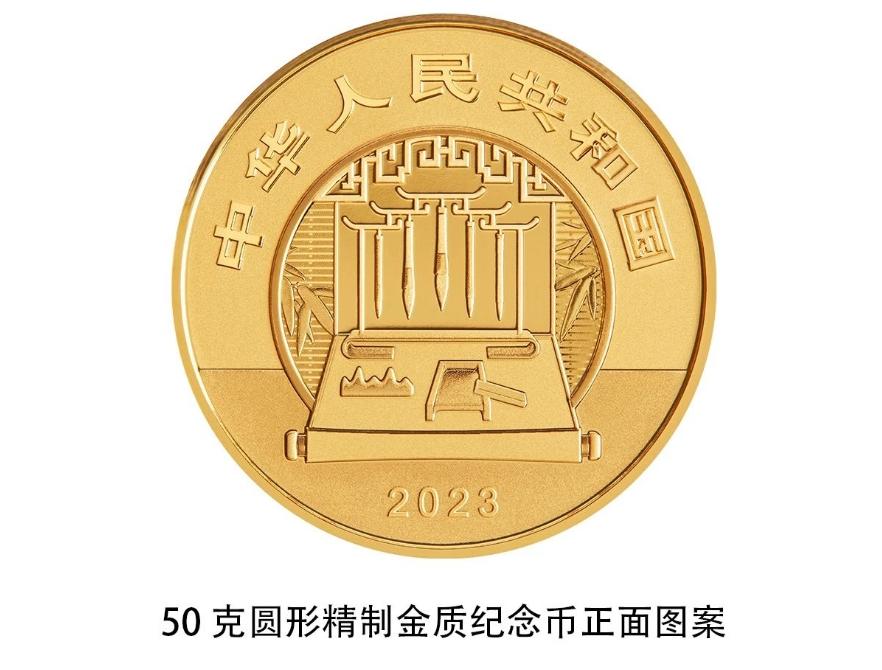4枚圓形金銀紀(jì)念幣正面圖案均為筆、墨、紙、硯造型,輔以竹葉、窗等裝飾組合設(shè)計(jì),并刊國(guó)名、年號(hào)。