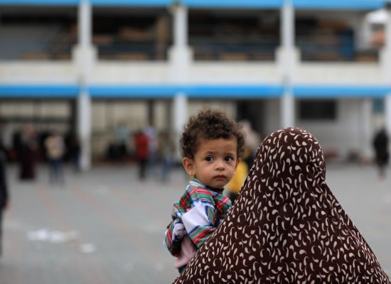 10月9日,一名婦女抱著小孩在加沙地帶南部城市汗尤尼斯的一所學(xué)校躲避以色列空襲。新華社發(fā)(亞西爾·庫(kù)迪攝)