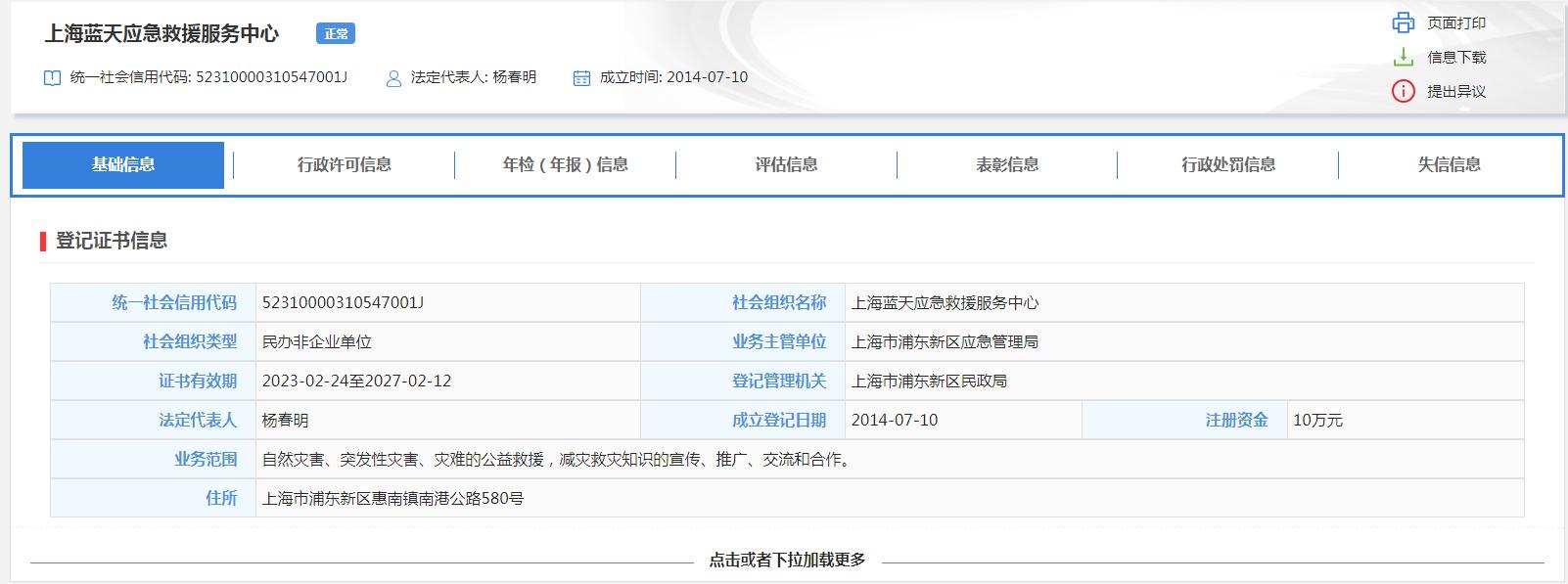 企查查信息顯示,上海藍天應急救援服務中心成立于2014年,法人為楊春明。全國社會組織信用信息公示平臺顯示,其成立登記日期為2014年7月10日,系民辦非企業(yè)單位,登記管理機關為上海市浦東新區(qū)民政局。