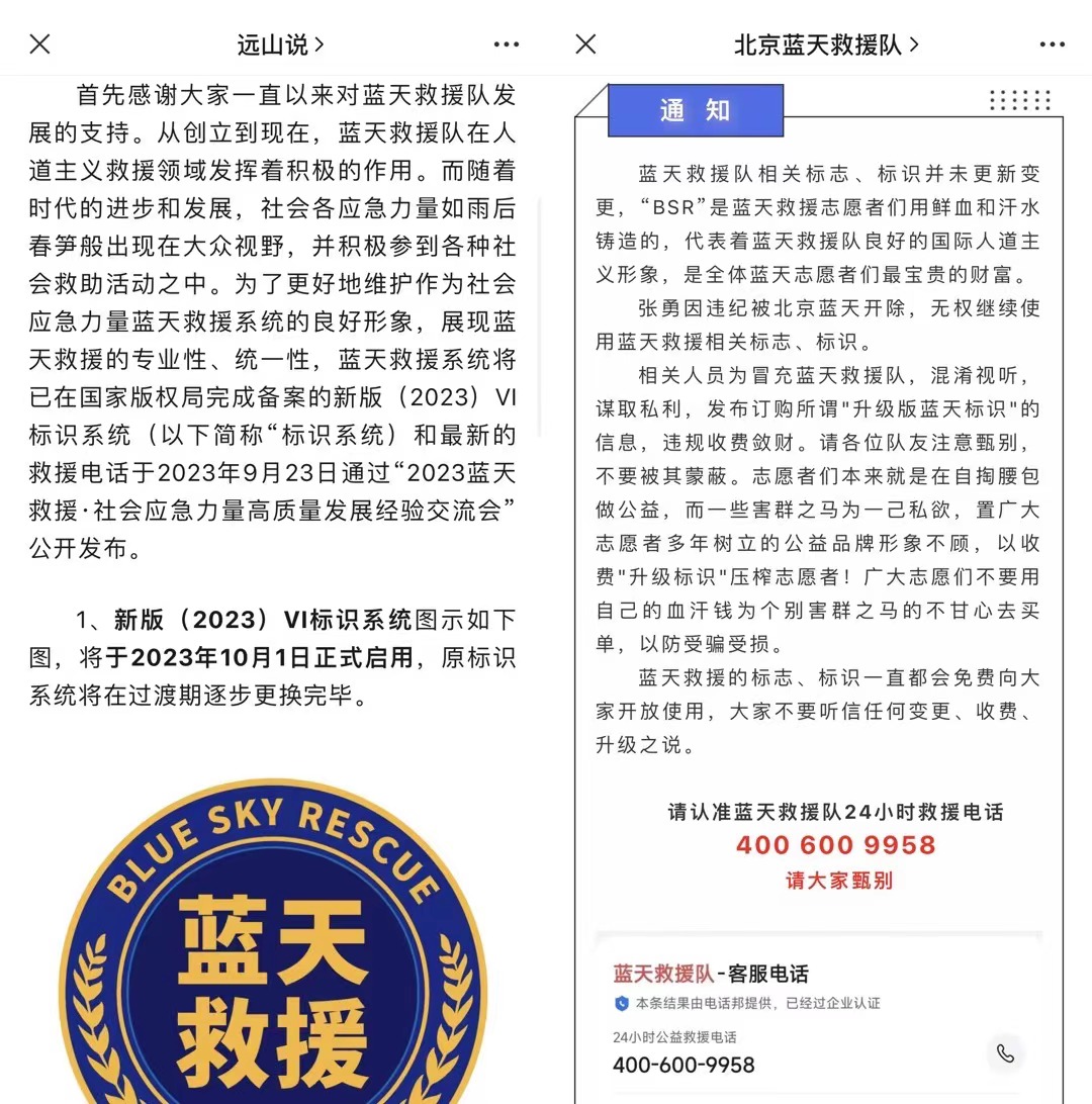 中新網(wǎng)注意到,今年9月30日,張勇在“遠山說”公眾號上發(fā)布了《藍天救援關于更換VI標識系統(tǒng)、救援電話的公告》,稱將于2023年10月1日正式啟用。就在啟用當天,北京藍天救援隊公眾號發(fā)布信息稱“藍天救援隊相關標志、標識并未更新變更。不要聽信任何變更、收費、升級之說?!?/p>