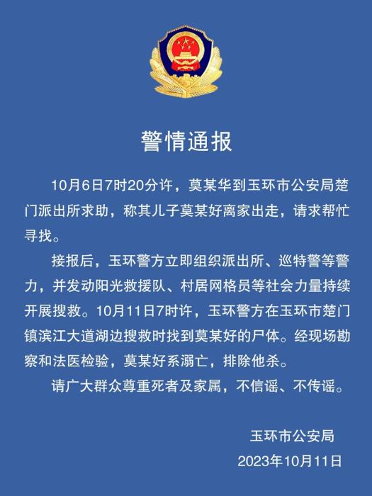 中新網(wǎng)10月11日電 浙江省玉環(huán)市公安局11日在其官方微信發(fā)布警情通報稱,10月6日7時20分許,莫某華到玉環(huán)市公安局楚門派出所求助,稱其兒子莫某好離家出走,請求幫忙尋找。