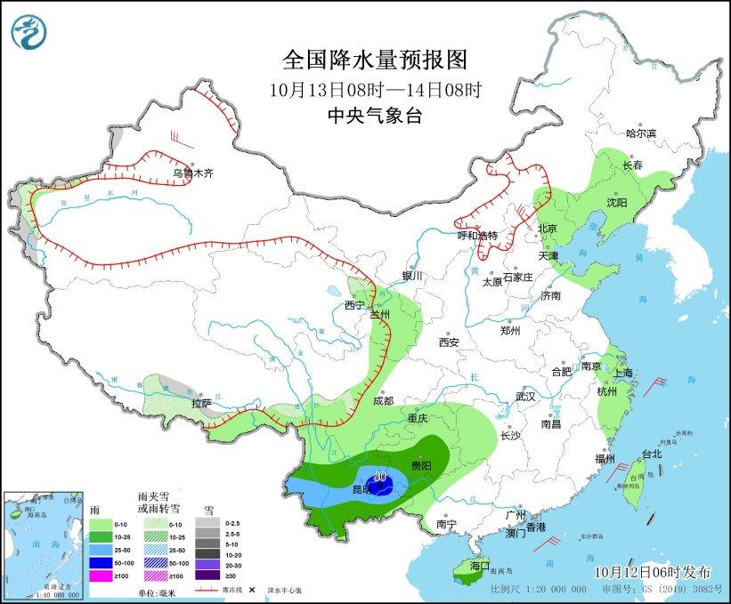 10月13日08時至14日08時,新疆西部、西藏南部等地部分地區(qū)有小雪或雨夾雪;四川南部、貴州中南部、云南大部等地部分地區(qū)有中到大雨,其中,云南東部局地有暴雨(50~80毫米)。新疆西北部、河北北部等地部分地區(qū)有5~6級風(fēng);臺灣海峽、巴士海峽、南海北部海域、北部灣等海域有5~7級風(fēng)、陣風(fēng)8級。(見圖2)。