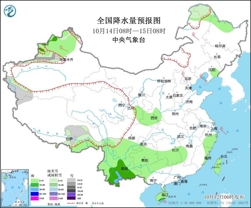 10月14日08時至15日08時,內(nèi)蒙古東北部、新疆西部、西藏南部等地部分地區(qū)有小到中雪或雨夾雪;黑龍江西北部、遼寧東部、陜西南部、甘肅東南部、四川南部、貴州大部、云南、廣西西部、湖南中南部、江西西南部、浙江中東部、福建東部、海南島及臺灣島等地部分地區(qū)有小到中雨,其中,云南南部局地有大雨。內(nèi)蒙古東北部、新疆西北部、河北北部等地部分地區(qū)有5~6級風(fēng);渤海、渤海海峽等海域有6~7級風(fēng)、陣風(fēng)8~9級。(見圖3)。
