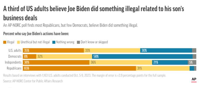 據(jù)報道,共和黨人中65%認為拜登在與亨特·拜登的業(yè)務關系中存在非法行為,而只有8%的民主黨人這么認為。與共和黨人相比(31%),更多的民主黨人(32%)表示他們認為拜登的行為“不道德”,但并未 “違法”。58%的民主黨人表示,拜登 “沒有做錯任何事”。