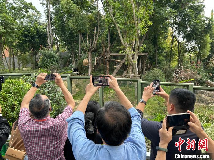 當日,第六屆臺胞社團論壇四川分線路考察暨首屆“情融兩岸·品悟天府”臺胞社團領(lǐng)袖四川行活動走進熊貓基地。金秋的熊貓基地陽光燦爛,大熊貓在圈舍中或坐或臥,也有的抱著竹子大快朵頤,追逐嬉戲,十分可愛。