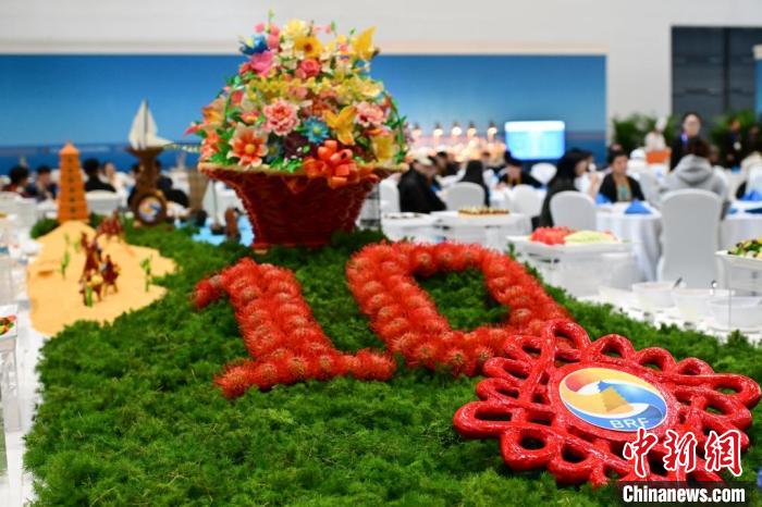 論壇新聞中心大門兩側(cè)擺放著兩塊主題燈光展板,走近細看,航行在大海中的帆船、在沙漠中行走的駱駝、“一帶一路”共建國家標志性建筑物等多個具有象征意義的圖案細節(jié)盡在其中。在餐廳中央取餐臺上,代表著共建“一帶一路”倡議10周年的數(shù)字“10”,和祈年殿等中國古建筑物代表性元素也都精妙地融于一體。