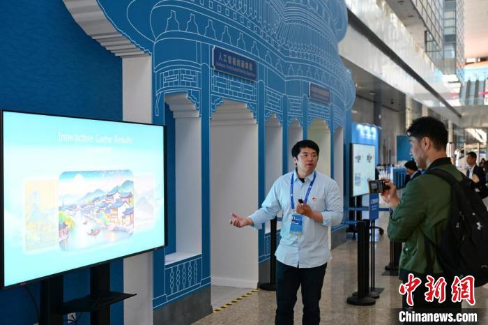 10月15日,北京,工作人員為媒體記者介紹人工智能繪畫體驗項目。當日,位于國家會議中心的第三屆“一帶一路”國際合作高峰論壇新聞中心啟動試運行。 中新社記者 田雨昊 攝