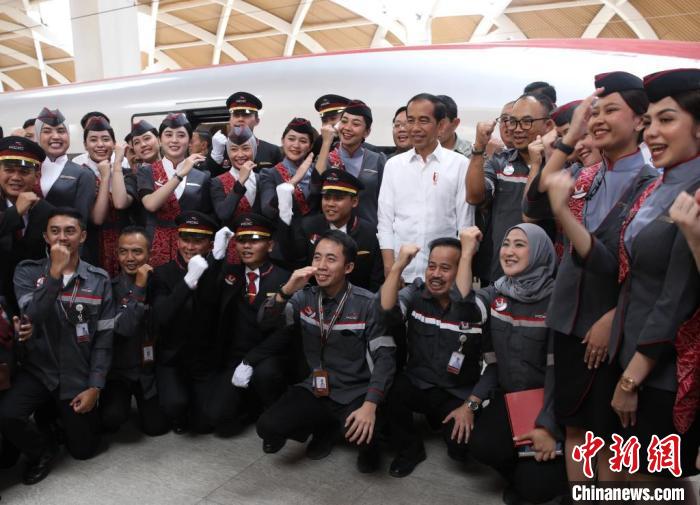 9月13日,印度尼西亞總統(tǒng)佐科考察中印尼合作項(xiàng)目雅萬(wàn)高鐵,并在哈利姆站乘坐G5901次高鐵列車赴帕達(dá)拉朗站。這是他首次乘坐雅萬(wàn)高鐵。圖為佐科在哈利姆站與乘務(wù)人員合影?!≈行律缬浾?李志全 攝