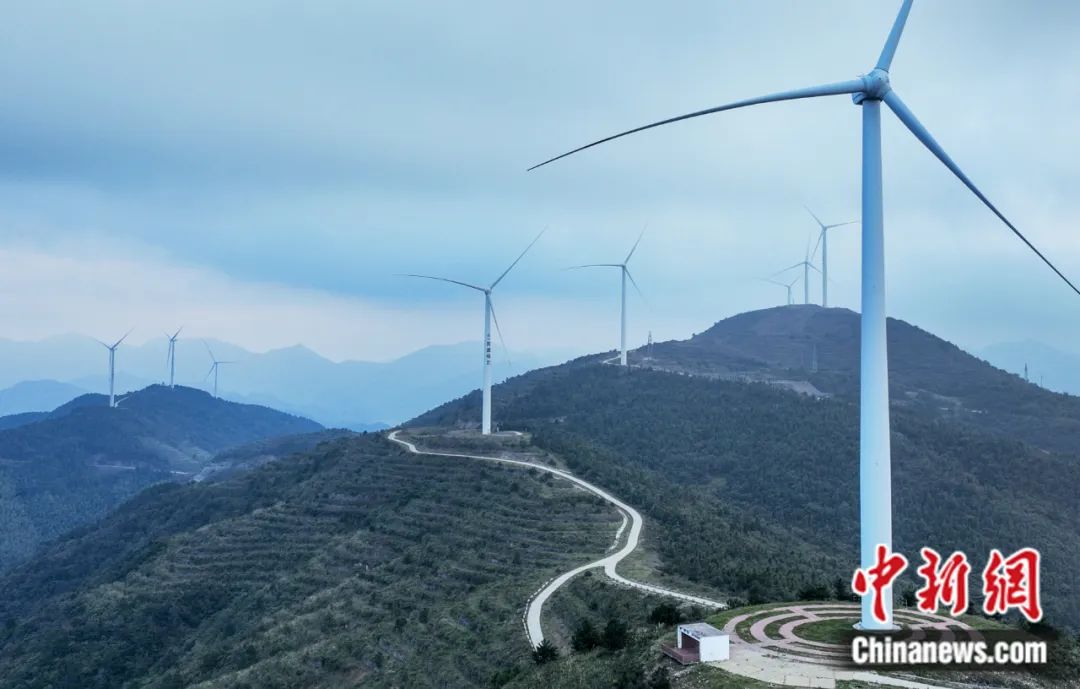 臺州市仙居縣廣度鄉(xiāng)風力發(fā)電機。(無人機照片)陳月明 攝