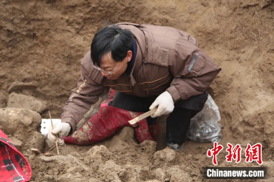 何利群在鄴城遺址東郭區(qū)佛教造像埋藏坑遺跡進(jìn)行現(xiàn)場發(fā)掘。鄴城考古隊(duì)供圖