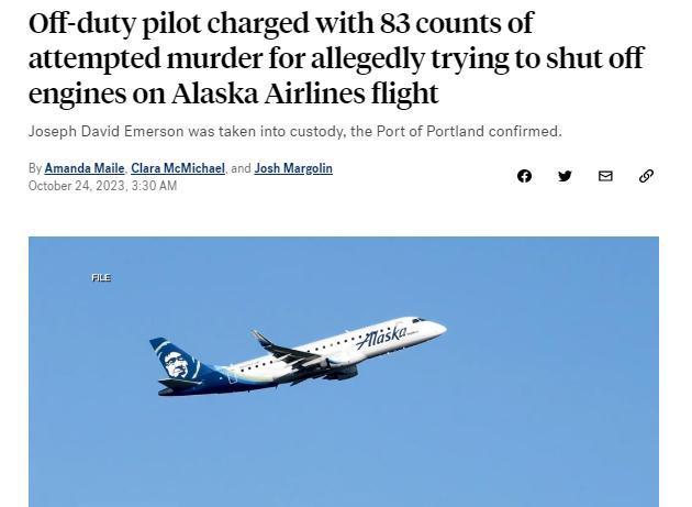 中新網(wǎng)10月24日電 綜合美媒24日?qǐng)?bào)道,美國(guó)官員透露,近日,美國(guó)阿拉斯加航空一趟航班遭遇了一起驚險(xiǎn)事件,一名未當(dāng)班的飛行員試圖在飛行途中關(guān)閉發(fā)動(dòng)機(jī)。目前,這名飛行員已被控83項(xiàng)謀殺未遂罪名。
