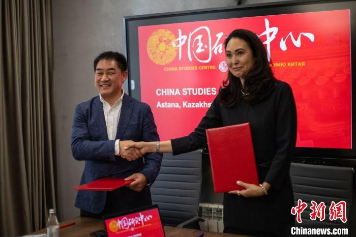 當?shù)貢r間24日,哈薩克斯坦阿斯塔納,哈薩克斯坦中國研究中心主任古麗娜爾與上海交通大學醫(yī)學院院長辦公室副主任童天朗簽署合作備忘錄?! ≈鬓k方供圖