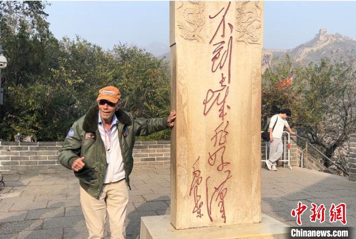 10月29日,102歲高齡的美國飛虎隊(duì)老兵哈里·莫耶登上北京八達(dá)嶺長城,并在“好漢碑”前豎起大拇指留影。中新社記者郭超凱 攝