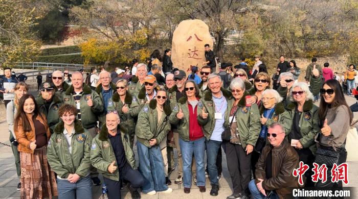 10月29日,美國飛虎隊(duì)老兵哈里·莫耶、飛虎隊(duì)指揮官陳納德將軍的外孫女尼爾·凱樂威以及一眾飛虎隊(duì)老兵家屬在北京八達(dá)嶺長城景區(qū)合影留念。中新社記者郭超凱 攝