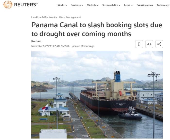 據(jù)報(bào)道,巴拿馬運(yùn)河管理局(ACP)在10月30日晚間的公告中表示,從11月3日開始,巴拿馬運(yùn)河的通行名額將從每天31個(gè)減少到每天25個(gè),并將在未來三個(gè)月內(nèi)逐步減少,計(jì)劃到2024年2月減少為每天18個(gè)名額。
