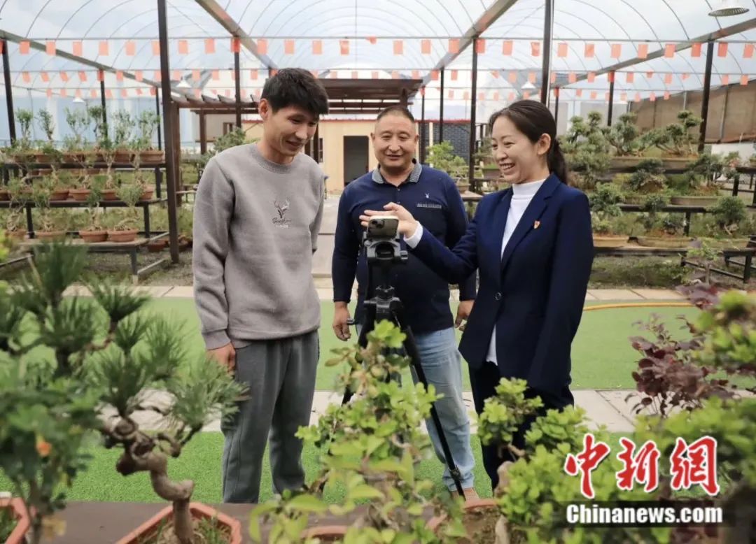 李敏指導(dǎo)村民直播銷售盆景。丁華明 攝