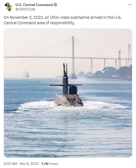 據(jù)報道,當天,美國中央司令部在社交媒體上發(fā)帖稱,“11月5日,一艘‘俄亥俄’級戰(zhàn)略潛艇抵達中東地區(qū)?!?/p>